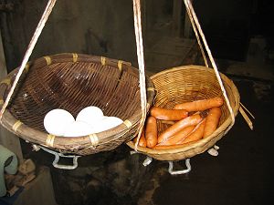 だ食材を地熱の蒸気で蒸しあげる。米は30分、玉子は10分、野菜は2分程度で蒸
