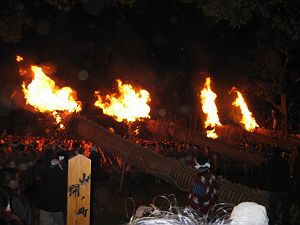 1メートルの大たいまつ6本に一斉に点火すると、境内が真っ赤に染まる。冷