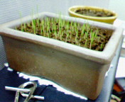 会社のパソコンの上に、先日「ちょびしばちゃん(商品名)」を植えてみた。芽が出てきた。しかも出社時より明らかに伸びてるのには驚いた。会社で和めそうだ。そのうちミニ盆栽に挑戦しよう。ちなみに写真奥は、3ヵ月程経ってしまったが未だ不発の「ナガサボ(商品名)」。