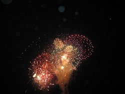 花火を観賞。仕掛け花火が川面に映り、空からは幾重に